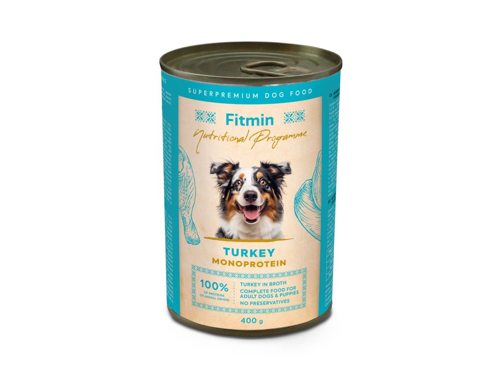 Kompletné mokré krmivo pre dospelé psy všetkých plemien z radu Fitmin Výživový program je vyrobené z čerstvého mäsa. Krmivo je vhodné aj pre šteňatá a mladé psy. Lahodné krmivo je vhodné na ochutenie granúl alebo za odmenu do misky. Monoproteínová konzerva s morčacím mäsom je vhodná pre malých aj veľkých maškrtných psov. Mokré krmivo Fitmin Výživový program je bez obilnín, bez GMO a neobsahuje žiadne farbivá, umelé konzervačné látky a dochucovadlá.